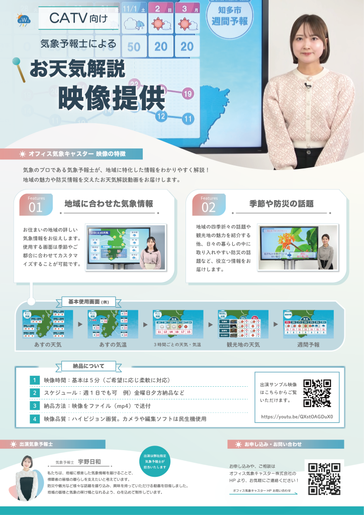 オフィス気象キャスター株式会社では、気象予報士が地域に特化したお天気解説を行う映像サービスをスタートしました。気象のプロならではの視点で、地域の皆様に役立つ気象情報や季節の話題、防災情報などをわかりやすくお届けします。